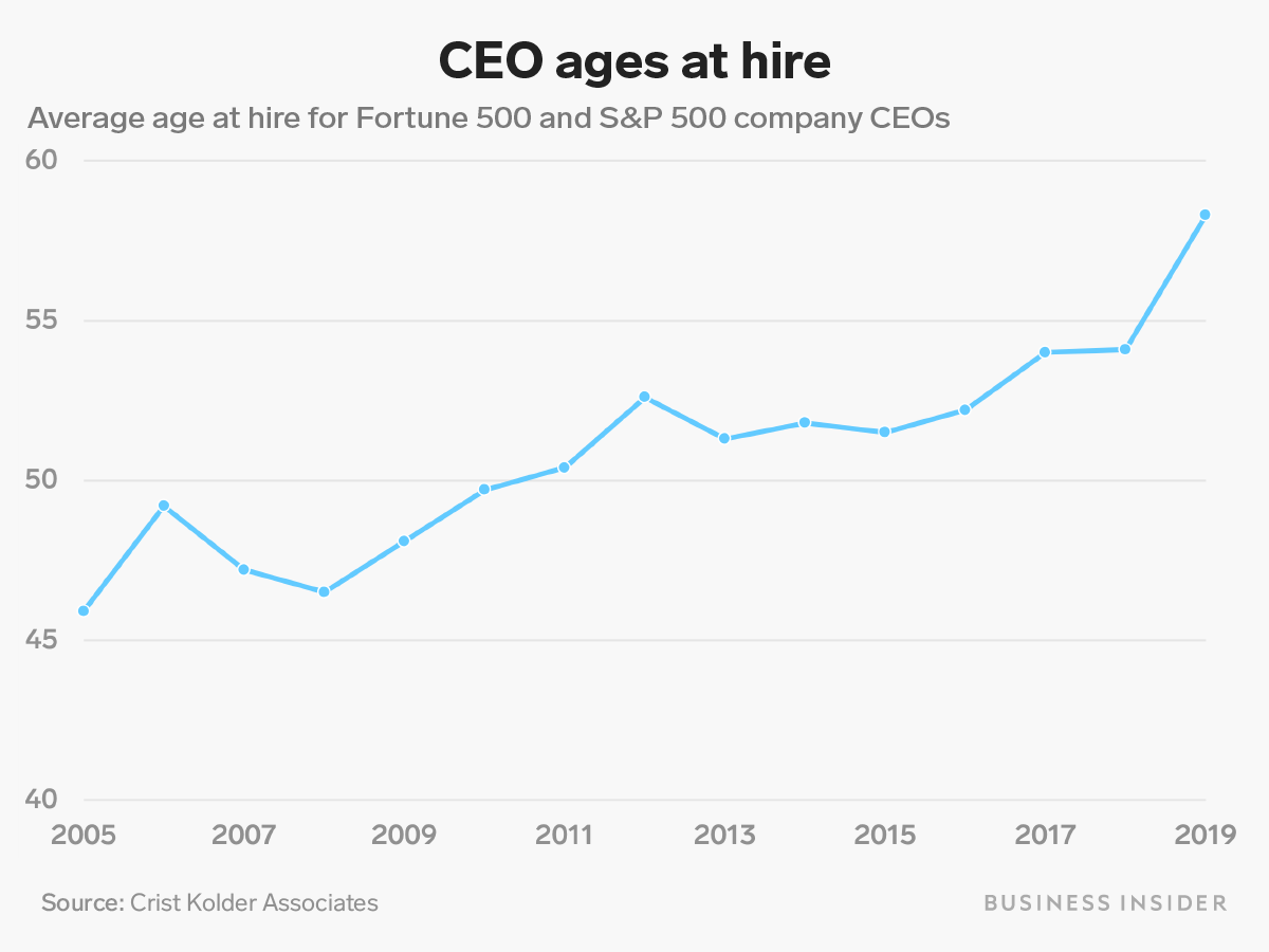 Pek çoğunuz bu veriyi daha önceleri görmüş olabilir, ancak hala çarpıcılığını koruyan bir veri olduğu için paylaşmadan edemedim. Dünyaca ünlü üst düzey yönetici ve yönetim kurulu adaylarının işe alım süreçlerini ele alan Crist Kolder danışmanlık şirketinin 2019 araştırmasına göre Fortune ve S&P 500 şirketlerinin Genel Müdürlerinin yaş ortalaması 10 yılda gözle görünür biçimde artmış. Yenilenen ve gelişen kurumların gençleştiğini düşünüyorsak bunun yanlış bir düşünce olduğunu görebiliyoruz.